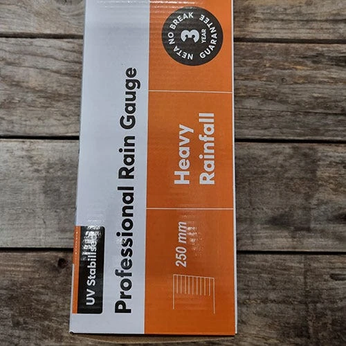 DESCRIPTION: Easy-to-install rain gauge with a large funnel opening to catch a larger surface area of rainfall. Attach to a post in a safe location where there will be no run-off from trees or roofs. Holds 250mm of water, marked in 1mm increments.